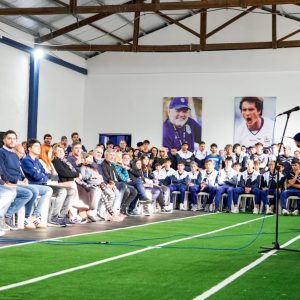 Acto seguido tocó la palabra el Coordinador de Juveniles Gabriel Perrone, quien afirmó “hoy sí realmente podemos disfrutar. Griguol (su suegro) decía si ‘querés que yo te haga un equipo de fútbol, me tenés que dar un buen campo de fútbol, 20 jugadores y 20 pelotas, Si no, no puedo’. Conclusión: es imposible hacer un equipo de fútbol si no tengo una cancha donde la pelota ruede bien y que tenga una pelota por jugador, no puedo hacer un equipo de fútbol. También decía, ‘si vos querés que yo el domingo haga golazos, tengo que hacer golazos en la semana’. Ese golazo no es producto de la casualidad, es producto de tener un buen campo de juego, de tener una buena pelota. Y cuando decimos campo de juego, hoy la pelota vuela, es muy difícil controlarla a la velocidad que va, porque hablamos de campos de juego con césped natural, mezcla de sintéticos, regada el día anterior, regada el día del partido, entonces la pelota vuela. Y si vos no te acostumbrás a entrenar en esa cancha, ese golazo que hizo Abaldo el otro día, es muy difícil poder concretarlo. Entonces, es para que entendamos que no es un capricho el de pedir canchas y pedir vestuarios y pedir las mejores herramientas posibles para que los chicos puedan entrenar y desarrollar todo su periodo de formación dentro de un contexto que es el que necesitan para poder llegar.”