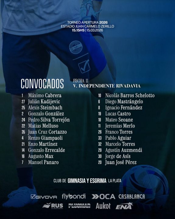 Convocados Gimnasia: 1-Máximo Cabrera y 27-Julián Kadijevic; 25-Alexis Steimbach, 2-Gonzalo González, 4-Renzo Giampaoli, 14-Gonzalo Errecalde, 35-Juan Cruz Cortazzo, 21-Enzo Martínez, 6-Diego Mastrángelo, 24-Pedro Silva Torrejón y 22-Matías Melluso; 18-Mateo Seoane, 16-Augusto Max, 33-Pablo Aguiar, 19-Lucas Castro, 8-Ignacio Fernández, 20-Juan José Pérez y 10-Nicolás Barros Schelotto; 26-Franco Torres, 11-Jeremías Merlo, 7-Manuel Panaro, 29-Agustín Auzmendi, 30-Jorge de Asís y 32-Marcelo Torres.